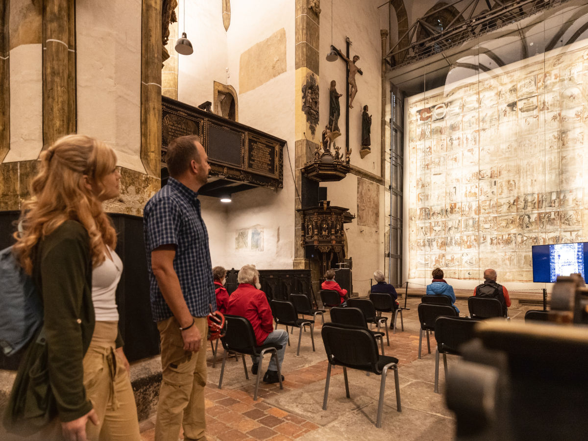 Das Große Zittauer Fastentuch von 1472 ist in der Kirche zum Heiligen Kreuz in Zittau zu sehen. Foto: Philipp Herfort