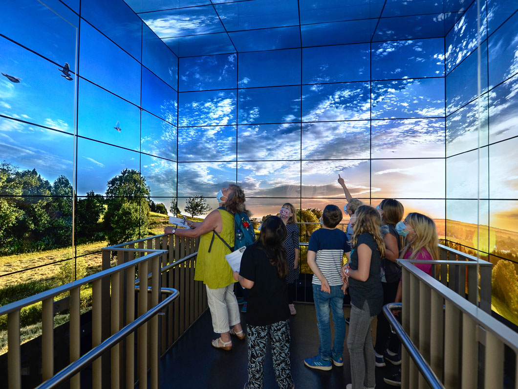 Los geht es im Mediawürfel, dem Time Cube. In dieser Rundum-Projektion laufen verschiedene kurze Filme zum sächsischen Pioniergeist und der Industriekultur.