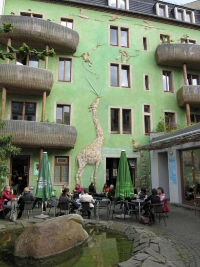 Nüsse, Öle, Seifen oder Waschmittel wandern stattdessen in beliebigen Mengen in mitgebrachte Tüten und Gläser. Hier gibt es eine erste Stärkung aus zwei Variationen Müsli mit Obst und Milch, bevor es anschließend in die langen, engen Straßenschluchten der im Wesentlichen von der Gründerzeitarchitektur geprägten Neustadt geht.