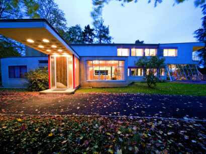 Exklusiv und ganz allein am Abend durchs Haus Schminke schlendern, auf der Terrasse einen Wein trinken, im Wintergarten gemütlich frühstücken: Das geht tatsächlich! Das Haus Schminke kann für eine individuelle Übernachtung außerhalb der Öffnungszeiten gebucht werden. Tagsüber buchstäblich aus Sonnenlicht gebaut, bestechen die Räume in der Abenddämmerung durch eine ausgefeilte Lichtregie und tauchen die Nacht in warmes Orange.