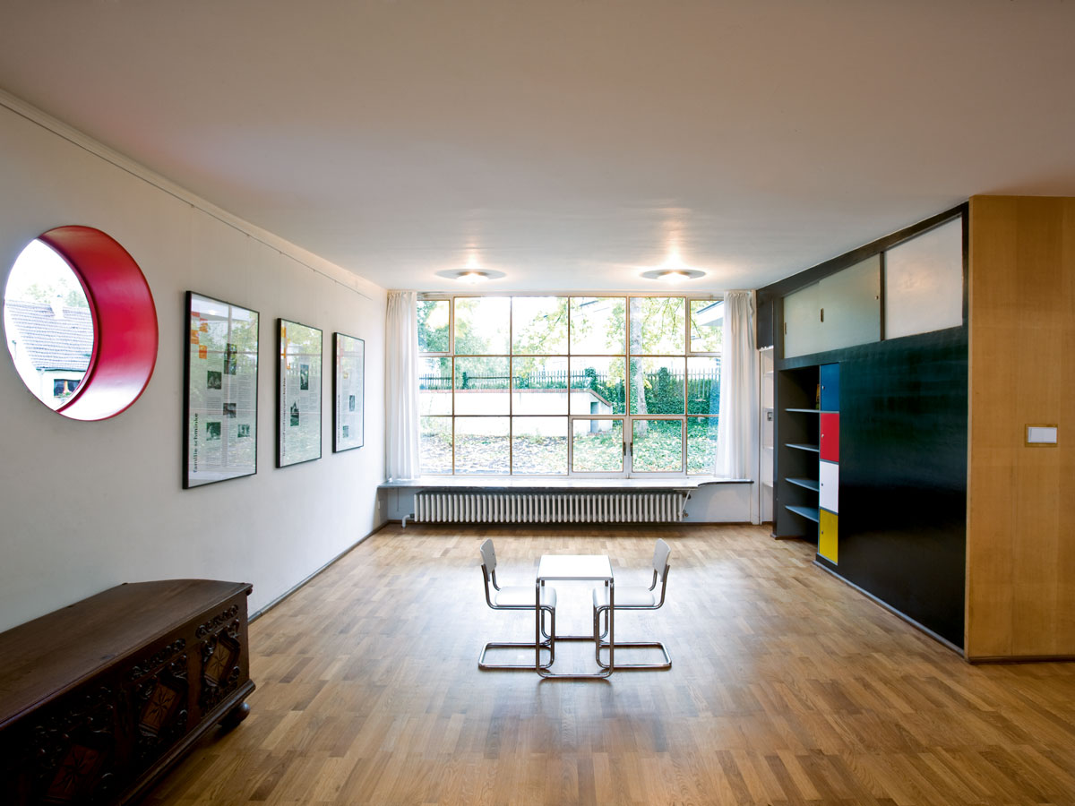 Vom Wintergarten mit plätscherndem Brunnen und herrlich unverstelltem Gartenblick über die funktionale, formschöne Frankfurter Küche und die ins Obergeschoss hinaufstrebende Treppe – was schon auf den ersten Blick wie aus einem Guss wirkt, entpuppt sich bei einer Führung oder einem Rundgang mit dem Audioguide als bis ins kleinste Detail durchdachtes Ensemble. Zum Ausprobieren verleiten die runden Gucklöcher aus buntem Glas in den Außentüren. Eingefügt sind sie auf halber Höhe und zeigten den Schminke-Kindern die Welt in immer anderen Farben.
