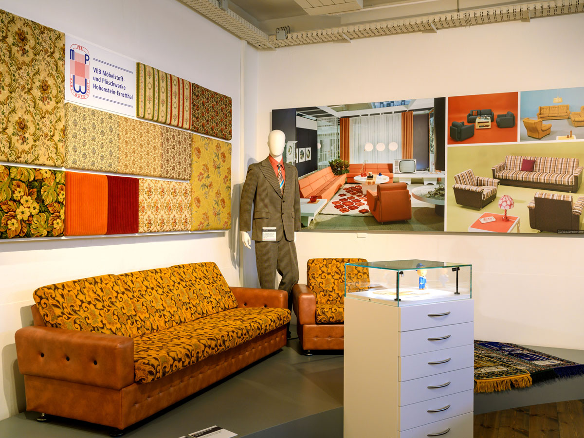 Möbelbezüge aus den 1970er Jahren wecken in der Ausstellung „Möwe, Hirsch und Sandmännchen – Von Hohenstein-Ernstthal in die Welt“ Erinnerungen. Foto: TRM Hohenstein-Ernstthal