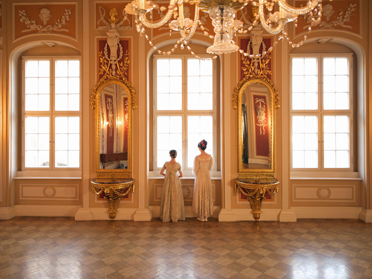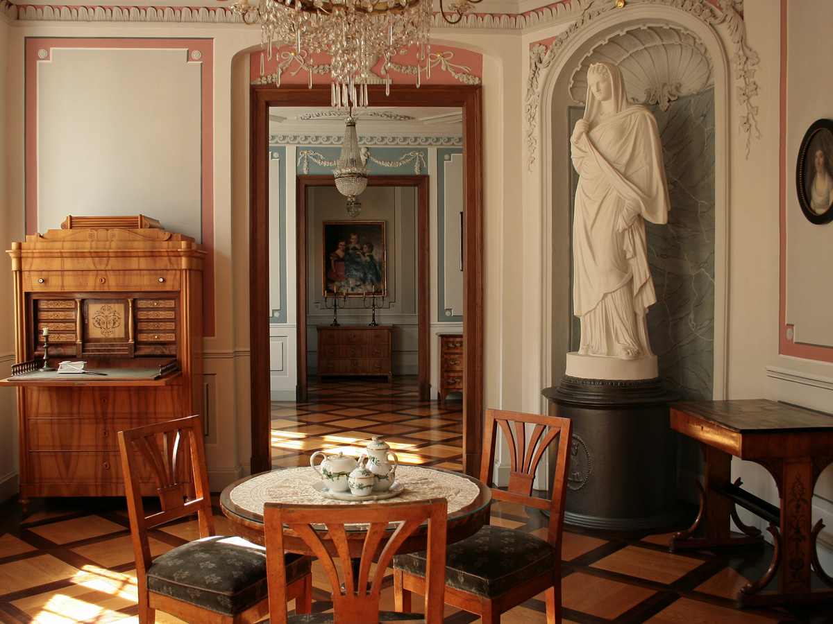 Im Inneren sind zahlreiche sorgfältig restaurierte Wohn- und Repräsentationsräume die architektonischen Glanzpunkte. In ihnen scheint die Zeit des späten 18. und frühen 19. Jahrhunderts stehengeblieben zu sein und man kann sich ausmalen, wie hier damals gelebt und gefeiert wurde. Das fällt auch in einem Zimmer leicht, in dem schon der französische Kaiser Napoleon I. 1812 eine Nacht verbrachte. Bis heute trägt der Raum die Bezeichnung „Napoleonzimmer“.