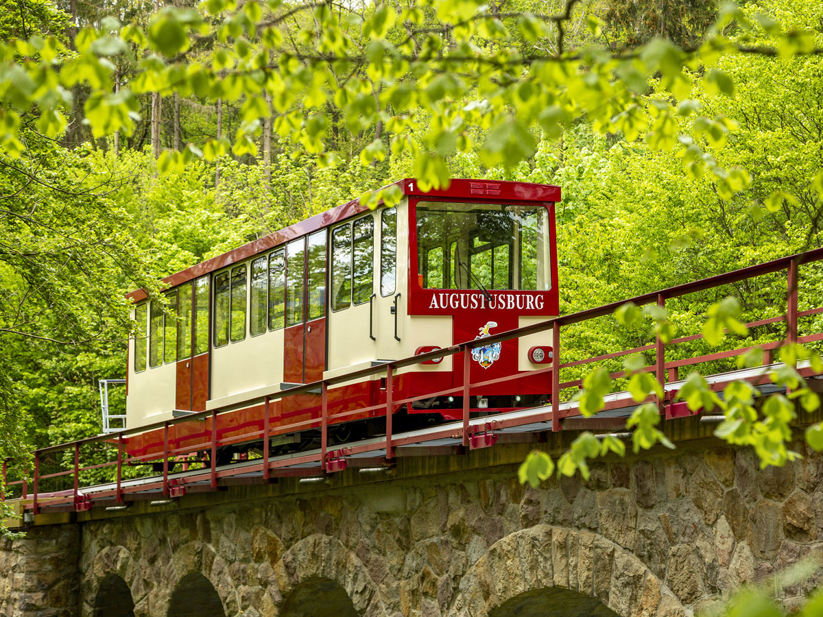 Die Standseilbahn verbindet Erdmannsdorf mit Augustusburg. Gemächlich fährt sie die rund 1,2 Kilometer in etwa acht Minuten durch den Erzgebirgswald hinauf zur Bergstation. Oben angekommen, wird es etwas rasanter, denn hier wartet schon das nächste Highlight: das Augustusburger Freizeitzentrum Rost’s Wiesen.