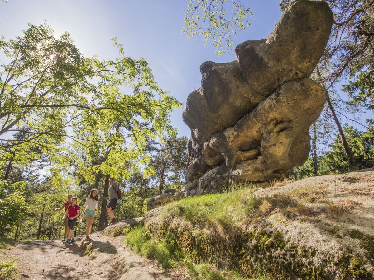 Auf dieser Familienwanderung ziehen auch wieder interessante Felsgebilde die Blicke auf sich. Hier haben vor allem Kinder etwas zu rätseln, denn sie laufen mitten durch den „Steinzoo“ und können dort „Löwe“, „Nashorn“ oder „Bernhardiner“ entdecken. Der Lehrpfad ist gut erreichbar vom Parkplatz an der Gondelfahrt oder lässt sich in eine Rundwanderung mit Start und Ziel am Parkplatz am Gebirgsbad integrieren. Am Wegesrand liegt die Waldbühne Jonsdorf, auf der in der Sommerzeit das Gerhart-Hauptmann-Theater Görlitz-Zittau gastiert.