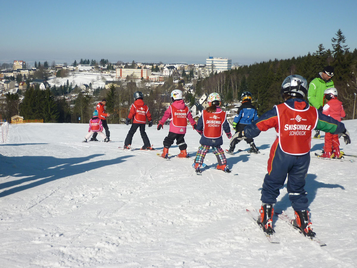 Den Panoramablick gibt es in der mit 800 Metern höchstgelegenen Stadt des Vogtlandes beim Skifahren gratis dazu. Auf insgesamt fast zwei Kilometern Pisten bietet die Skiwelt Schöneck als einziges zertifiziertes familienfreundliches Skigebiet Sachsens Wintervergnügen pur.