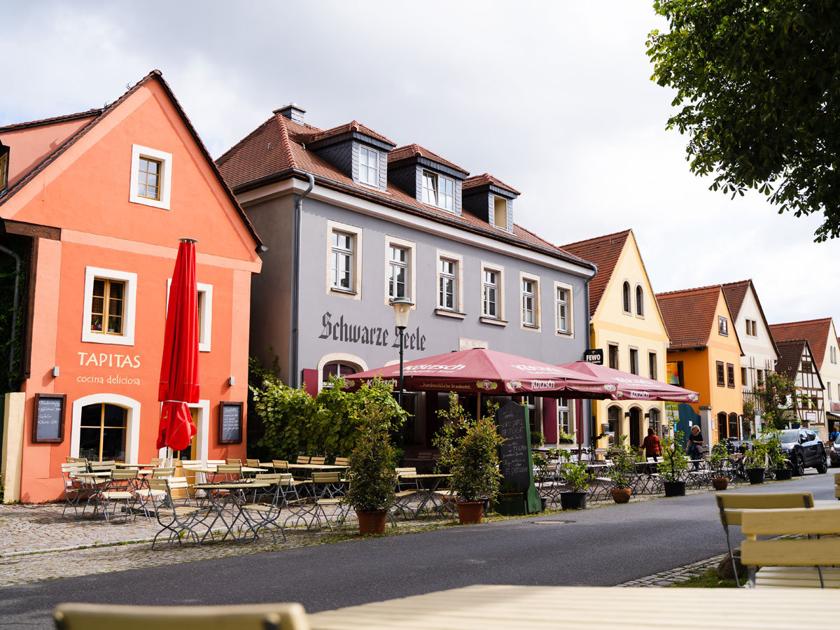 Wer hier vorbeirollt, muss dennoch nicht lange auf die nächsten kulinarischen Verlockungen warten. Nach nur 1,5 Kilometern verlangt der hübsche Dorfkern von Radebeul-Altkötzschenbroda definitiv nach einem kleinen Bummel oder auch einem längeren Aufenthalt. Cafés, Restaurants, Kneipen und Geschäfte in bunt gestrichenen historischen Häusern reihen sich zu beiden Seiten des baumbestandenen Dorfangers aneinander.