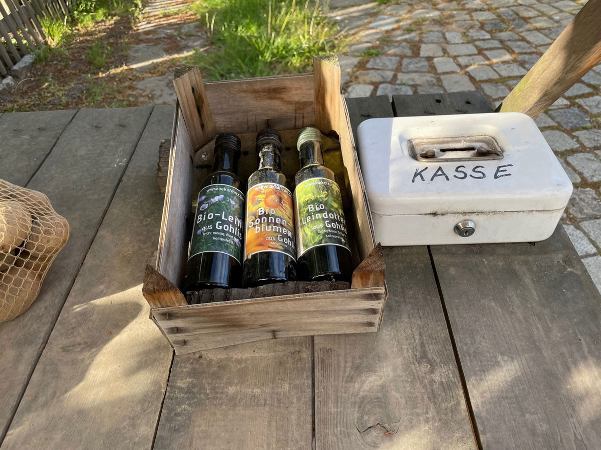 Für den heimischen Speiseplan gibt es unterwegs ebenfalls allerlei Leckeres, denn hier und da stehen frisch Geerntetes, regionale Marmeladen, Öl oder Honig zum Verkauf. Eine gute Adresse ist zum Beispiel der Biohof Ines Franz in der idyllischen Gohliser Dorfstraße, aber auch vor manchem Garten finden sich kleine Tische mit Obst, Gemüse und einer Kasse des Vertrauens. Das Angebot bestimmt die Saison.