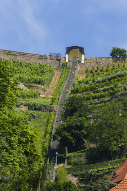 Da hilft kein Aufzug, hier kommt es allein auf Kondition und Willenskraft an. Dafür ist die Aussicht gratis und durchgehend geöffnet. Die barocke Spitzhaustreppe durch die Weinberge oberhalb der Hoflößnitz ist ein Klassiker, aber auch für alle, die sie schon kennen, immer wieder eine schöne Herausforderung. 220 Meter, 397 Stufen und 57 Absätze müssen bewältigt werden, bis die insgesamt 76 Höhenmeter gemeistert sind.