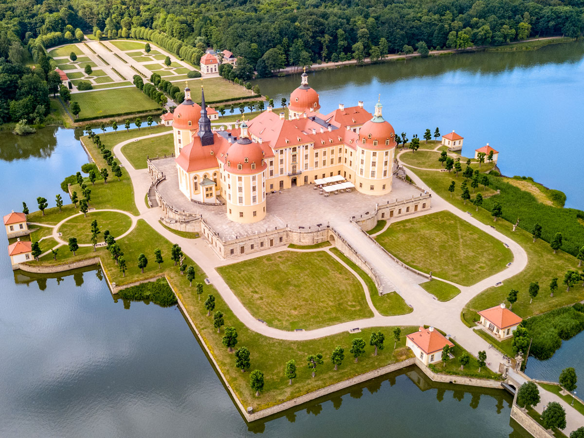 Alle Jahre wieder flimmert das barocke Schloss in der Weihnachtszeit im Märchenfilmklassiker „Drei Haselnüsse für Aschenbrödel“ von 1974 über die Fernsehbildschirme. Die Stelle, an der Aschenbrödel damals seinen Schuh auf der Freitreppe verlor, markiert heute ein überdimensionales Exemplar und immer im Winter ist im Schlossmuseum eine Ausstellung zum Film zu sehen – ein wahrer Pilgerort für Fans. 2018 war dann Hollywood zu Gast: Schloss Moritzburg diente Regisseurin Elizabeth Banks als Kulisse für die Actionkomödie „3 Engel für Charlie“.