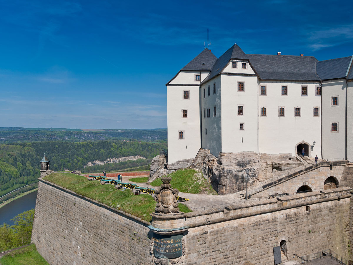 Einst lebten auf der Festung Königstein 247 Meter über der Elbe Soldaten mit ihren Familien wie in einer kleinen Stadt. Auch der Adel gab sich ein Stelldichein – so feierte Sachsens schillernder Kurfürst August der Starke hier pompöse Feste. Heute strömen Touristen auf das Felsplateau, dessen 1,7 Kilometer langer Panoramaweg entlang der äußeren Festungsmauer fantastische Ausblicke auf den Nationalpark Sächsisch-Böhmische Schweiz und Dresden bietet.