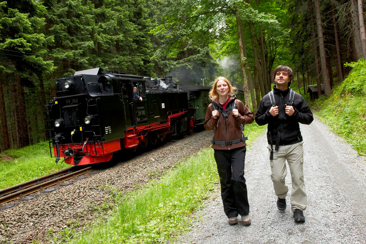 Tipps für Aktive: Meist parallel zur Strecke der Fichtelbergbahn verläuft der Erlebnispfad Bimmelbahn auf 21 Wanderkilometern. Wem das zu lang ist, der hüpft unterwegs einfach in den Zug. Mehr Adrenalin liefert eine rasante Downhill-Fahrt mit den grasgrünen Monsterrollern. Zurück auf den Berg geht’s entspannt mit der Dampfeisenbahn.