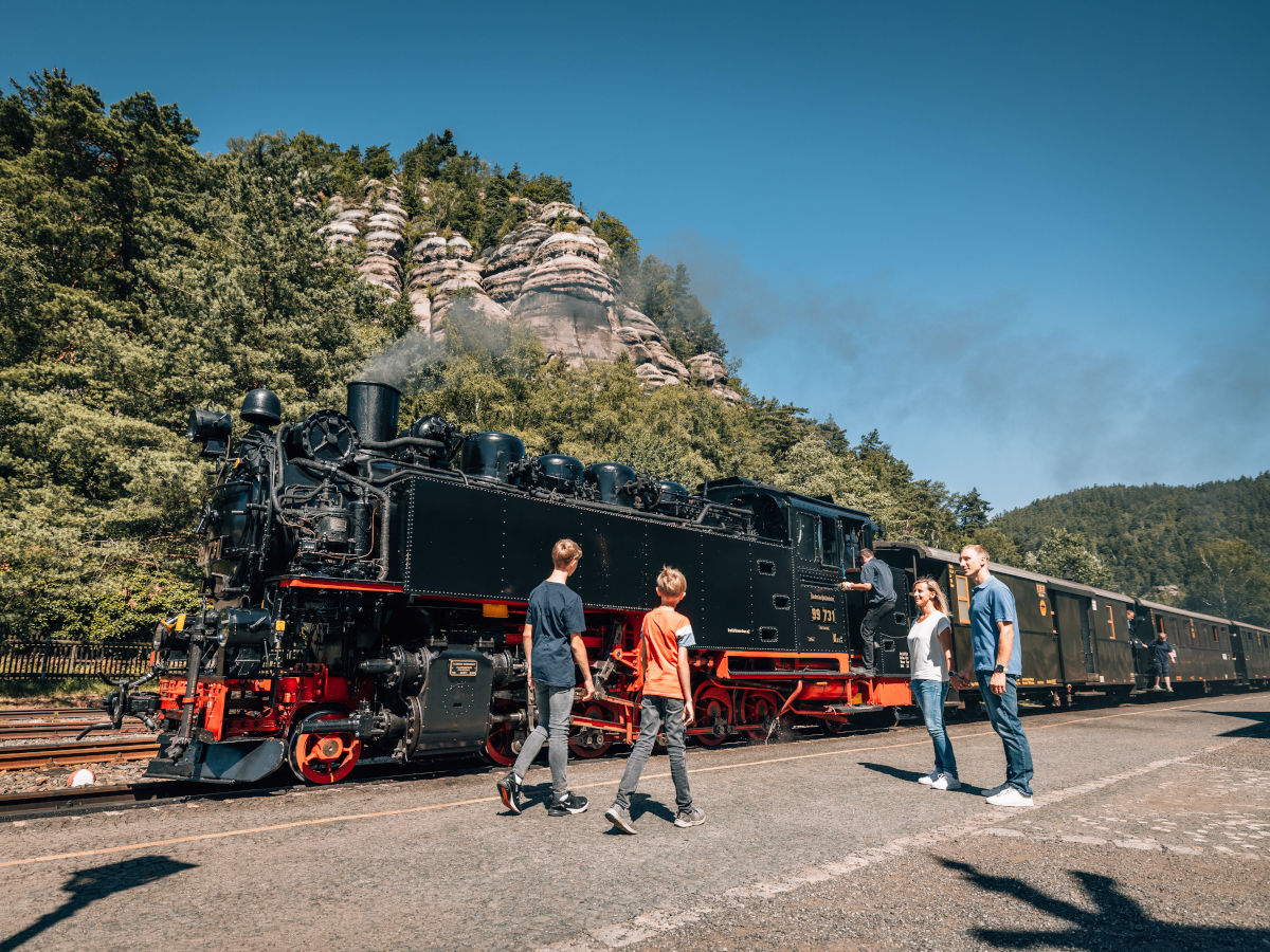 Ab Zittau bringt die Zittauer Schmalspurbahn Ausflügler mit Volldampf in die Kurorte Oybin und Jonsdorf im Zittauer Gebirge. Im offenen Aussichtswagen zieht die Landschaft während der 45-minütigen Fahrt besonders reizvoll vorbei. Auch ein Speisewagen gehört zum Gespann – derart gut gestärkt können die nächsten Aktivitäten kommen.