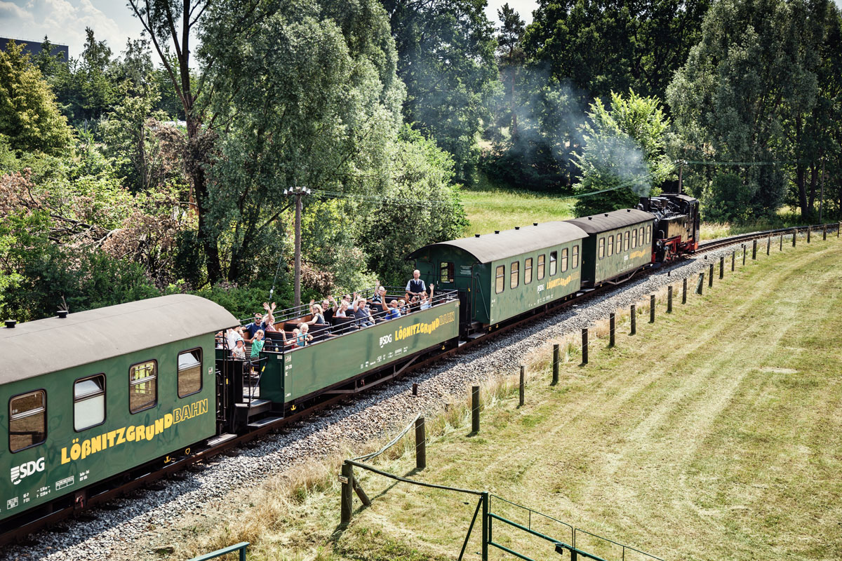 Die Lößnitzgrundbahn startet am Bahnhof Radebeul-Ost auf ihre rund 17 Kilometer lange Tour. Schnaufend lässt sie Villen und Weinberge hinter sich und taucht in den grünen Lößnitzgrund ein. Hier überwindet sie ein paar Höhenmeter und schlängelt sich durch die Moritzburger Teichlandschaft.