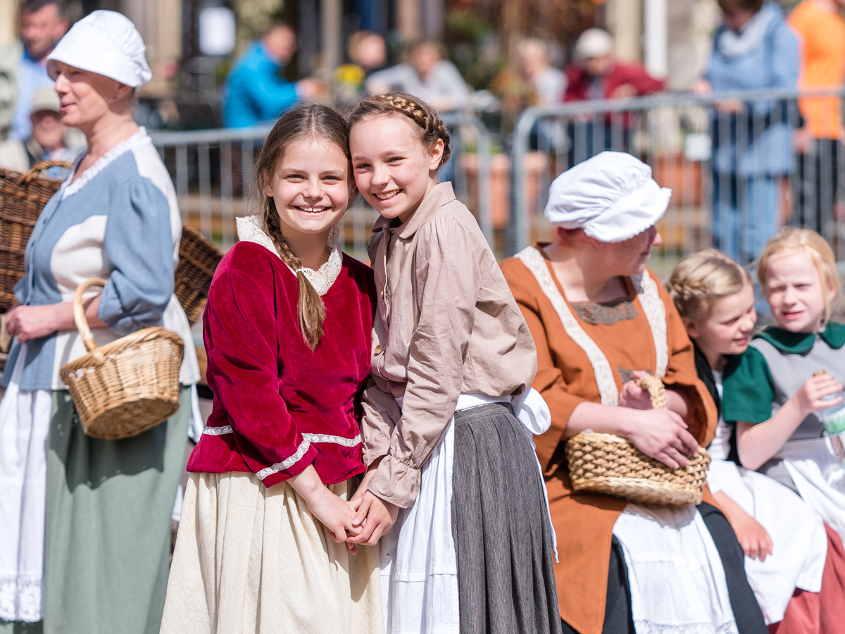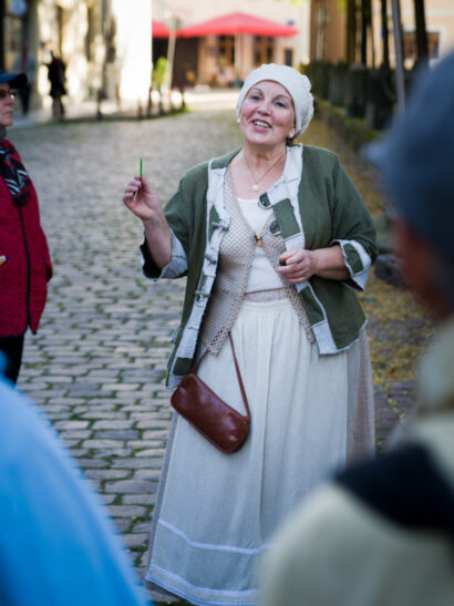 Von Weitem erkenne ich eine auffällig gekleidete Person. Gabriele Gerhardt, die in die Rolle einer Bürgersfrau des 17. Jahrhunderts geschlüpft ist, empfängt mich mit einem herzlichen Lächeln und den Worten: „Wollen wir ein bisschen biddeln?“ Auf meinen fragenden Blick schließt sie gleich eine Erklärung an. „Das bedeutet flanieren, spazieren, schlendern und dabei etwas Schönes sehen.“ Na dann, los geht’s.