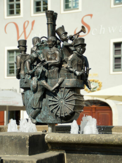 Jeden Samstag 18.15 Uhr stellen Posaunenbläser auf dem Balkon der Kirche ihr Können unter Beweis. Als wir um die Ecke biegen, steht eine Kindergartengruppe ganz aufgeregt vor einem Brunnen. Darauf thront der Erlpeter, der wohl beliebteste Pirnaer.