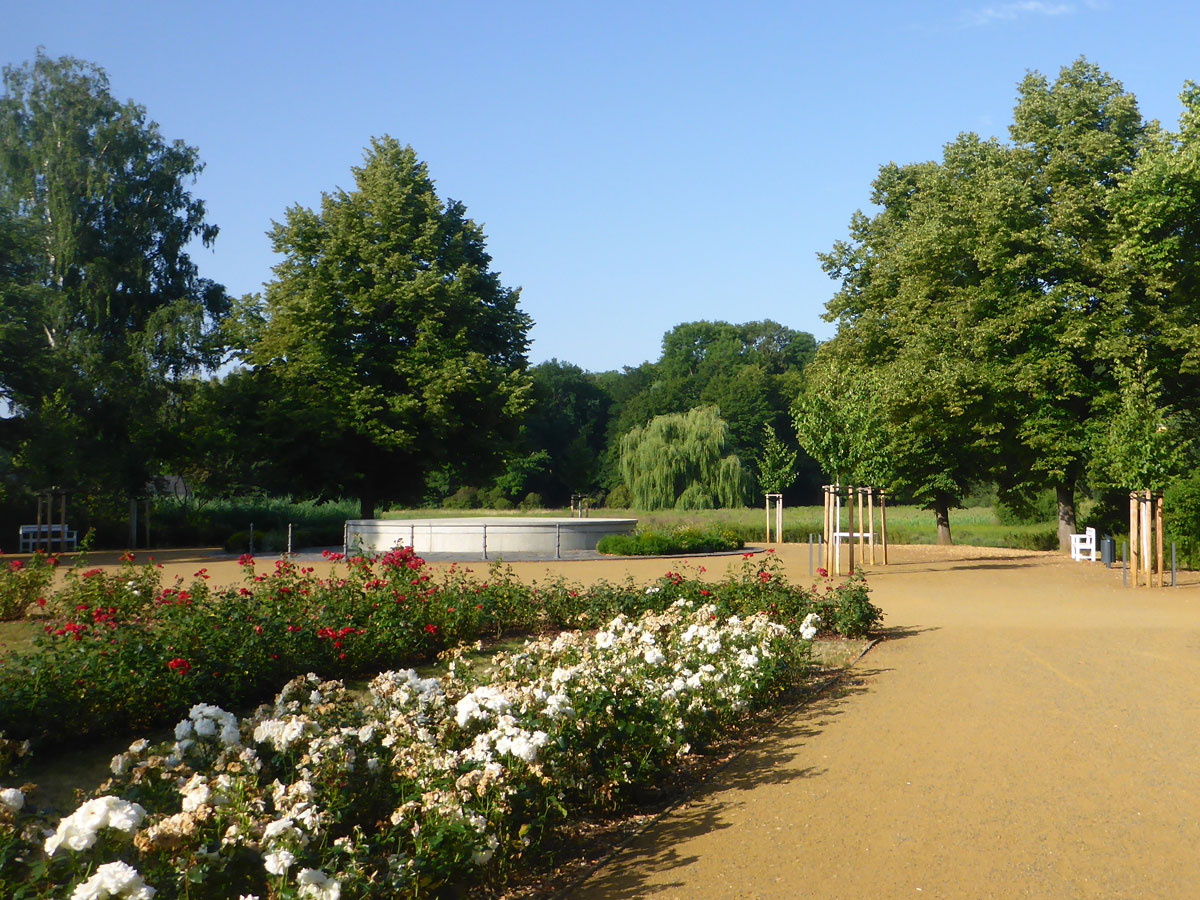 Zwei Gewässer prägen den Park: der zentrale Schwanenteich und der deutlich kleinere Lange Teich an der Ostseite. Ringsum erstrecken sich zahlreiche gepflegte Wege und weite Wiesen, gesäumt von schattenspendenden Bäumen und ausgedehnten Laubsträuchern. Für Farbtupfer im üppigen Grün sorgen jedes Jahr die ersten filigranen Frühlingsboten auf der Krokuswiese, die vollen Blüten der Rhododendren oder die sommerlichen Rosenpflanzungen im Rosen- und im Musikgarten.