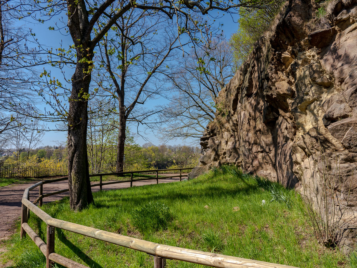 Eine ebenso schöne Aussicht ins Tal bieten die Bastionen am Rande der einstigen Steinbruchwände. Von hier wie auch vom Turm zeigt sich ein nahezu perfektes Modelleisenbahn-Panorama mit Fluss, Autobahnbrücke und Bahngleisen, winzigen Autos, die im Felsentunnel verschwinden, der ehemaligen Felsenkellerbrauerei, dem alten Bahnhof und von Zeit zu Zeit sogar mit einer leuchtend roten S-Bahn.