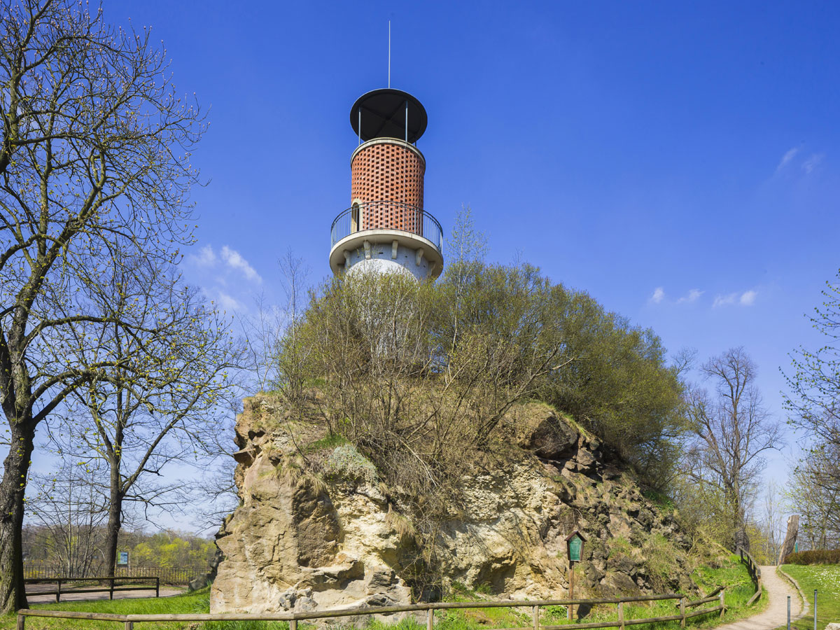Und was hat es nun mit dem „Hohen Stein“ auf sich? So wird der Felsbuckel bezeichnet, auf dem der Aussichtsturm errichtet wurde. Er ist gleichzeitig als geologisches Naturdenkmal geschützt, denn vor Millionen von Jahren brachen sich hier die Wellen eines kreidezeitlichen Meeres. Wertvolle Fossilien wie versteinerte Muschelschalen, Haifischzähne und Seeigelstacheln wurden in der einstigen Brandungsklippe aus Monzonit entdeckt.