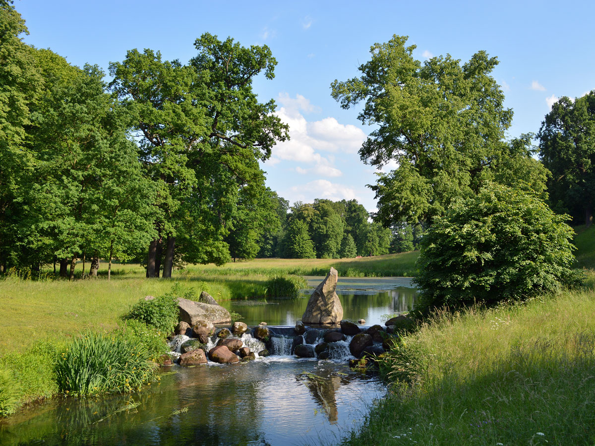 Lucie von Pückler beeinflusste maßgeblich die Uferlinien am Eichsee und ließ einen großen Findling inmitten des Wasserfalls aufstellen. Foto: Stiftung „Fürst-Pückler-Park Bad Muskau“/Astrid Roscher