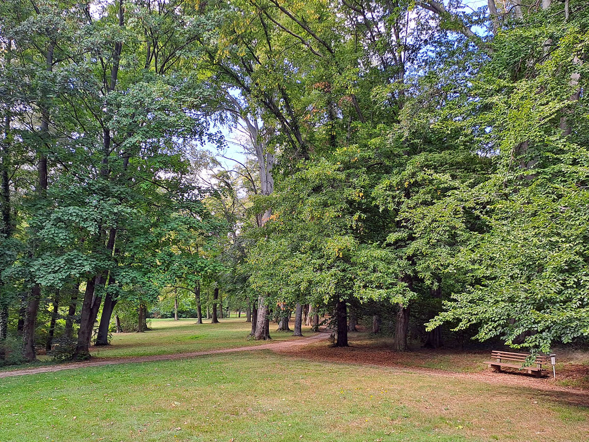Während der Park zwischen Schloss und Gruft eben und gepflegt ist, öffnet sich hinter dem Mausoleum ein naturbelassenes Gelände, das mit großen Bäumen, markanten Felsformationen, künstlichen Wasserläufen, allerlei historischen Bezügen und abenteuerlicher Romantik verzaubert. Auf dem Rückweg schimmert das Schloss hell durch die Bäume und lädt zu einem Besuch ein.