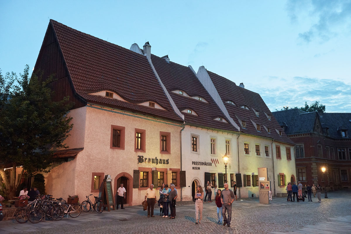 Noch weiter in die Vergangenheit als das Gewandhaus und das Schumann-Haus entführen der Dom. St. Marien und die Priesterhäuser an der westlichen Marktseite. Der spätgotische Dom ist mit 88 Metern das höchste Bauwerk Zwickaus. In seinem Inneren birgt er wertvolle Kunstschätze, zum Beispiel einen Flügelaltar des Dürer-Lehrers Michael Wolgemut und Peter Breuers Figurengruppe der Beweinung Christi.