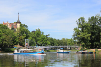 Während der Sommersaison starten die Muldeschiffe an der stählernen Hängebrücke zu Touren flussauf- und flussabwärts. Foto: Kati Lange