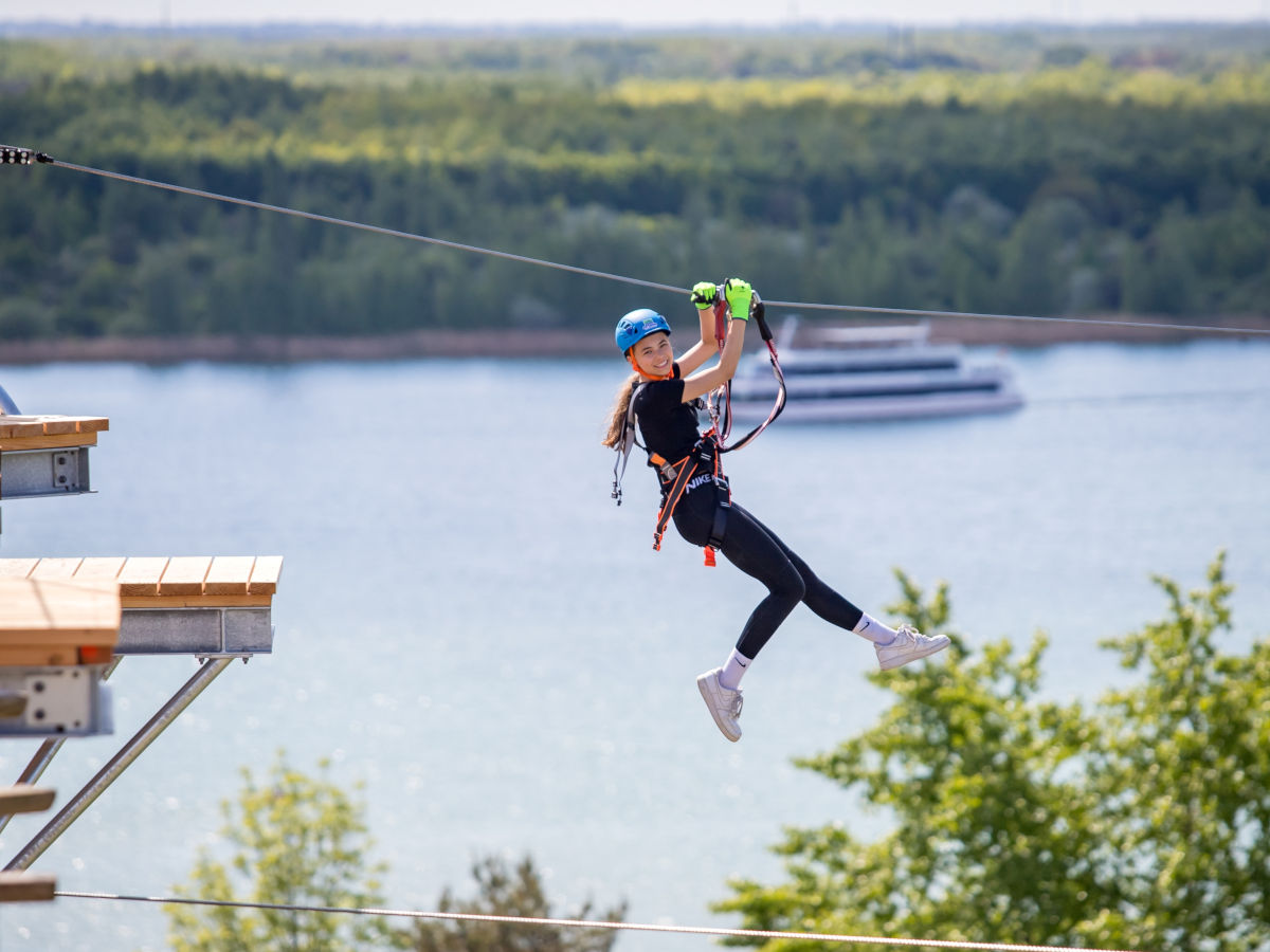 Im 2025 wiedereröffneten Kletterpark können Abenteuerlustige an mehreren Ziplines durch die Luft sausen – inklusive Blick über den Markkleeberger See. Foto: Kletterpark Markkleeberg