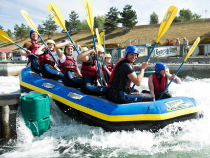 Beim Rafting, das zweieinhalb Stunden Wildwasserspaß verspricht, ist die komplette Zeit über ein Guide mit an Bord. Nach der Einkleidung in Neoprenanzug, Schwimmweste, Schuhe und Helm sowie einer Einweisung mit Sicherheitshinweisen und Kommandos geht es aufs rauschende Wasser. Hier können dann sechs bis acht Touren am Stück gefahren werden. Noch schneller und wilder schießen die Schlauchboote beim Power-Rafting durch den Kanal.