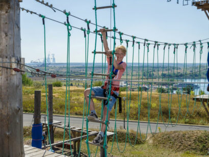 In bis zu neun Metern Höhe beeindruckt der Kletterpark mit seiner spektakulären Panoramaaussicht über das Neuseenland bis ins nahe Leipzig. In Richtung Störmthaler See bleiben die Blicke immer wieder am riesigen Schaufelradbagger des Bergbau-Technik-Parks hängen, der mehr zu den Ursprüngen des Leipziger Neuseenlandes als ehemaliges Braunkohletagebaugebiet verrät.