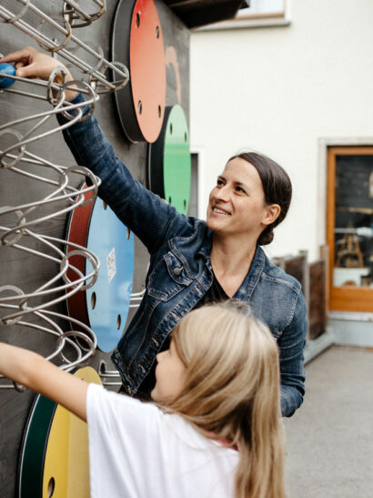 Auf schmalen Metallstreben rollt die Kugel auf der extralangen Bahn sanft dahin, bis sie plötzlich nach unten fällt und auf der nächsten Ebene weiterrollt. Farbige Halterungen kippen nach links oder rechts und lenken den Ball immer wieder in überraschende Bahnen. Nicht nur für kleine Gäste eine Riesenfreude – hier kann man sich ruhig auch als Erwachsener mal die Kugel geben!