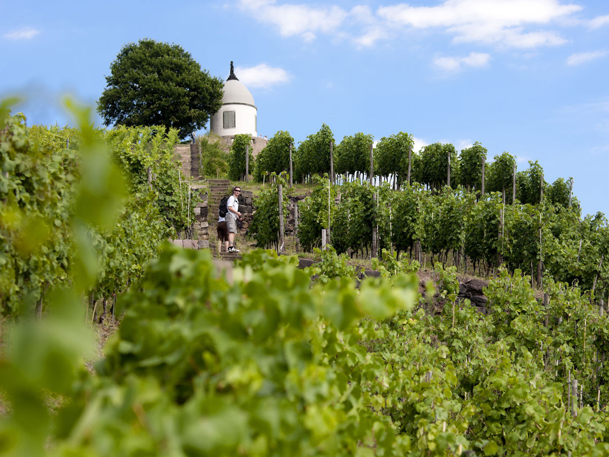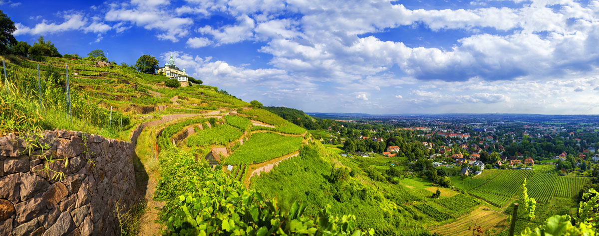 Schloss Wackerbarth, Erlebnisweingut und einstiger Alterssitz des Reichsgrafen August Christoph von Wackerbarth, beeindruckt unweigerlich mit seiner Kulisse. In barocker Symmetrie ziehen sich Rasenterrassen zwischen Schloss und Belvedere den allmählich ansteigenden Hang hinauf. Hoch zu den Weinstöcken von Riesling, Traminer und Scheurebe führt auch ein Pfad. Er beginnt auf der Treppe hinter dem Belvedere. Jeder Schritt, jede Stufe, jeder an Höhe gewonnene Meter fügt dem Panorama im Tal ein weiteres Puzzleteil hinzu.