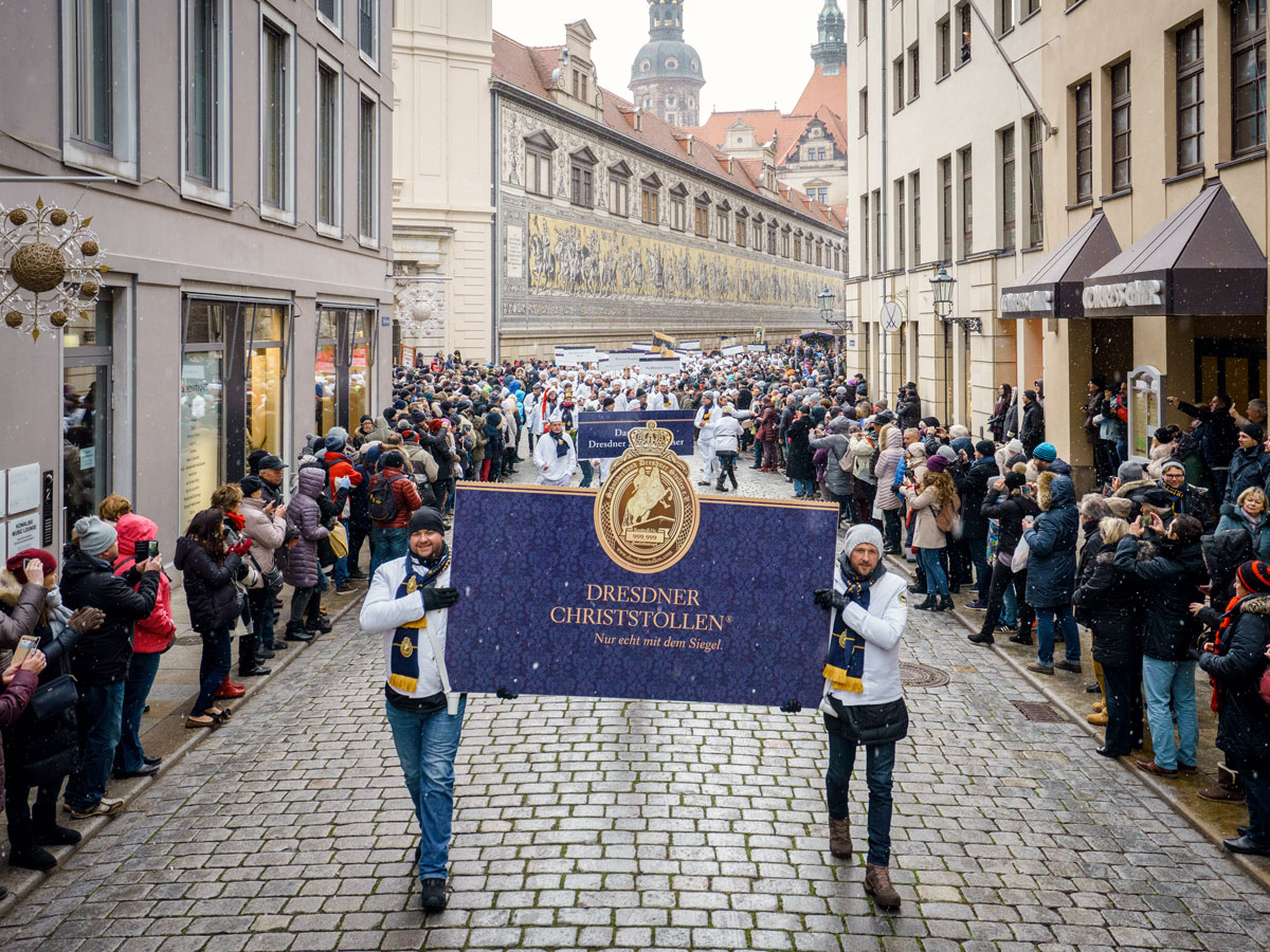 Mit einem Umzug und einem Riesenstollen feiern die Mitglieder des Schutzverbandes Dresdner Stollen am Samstag vor dem zweiten Advent das Stollenfest. Foto: Schutzverband Dresdner Stollen e. V./Michael Schmidt (DML-BY)