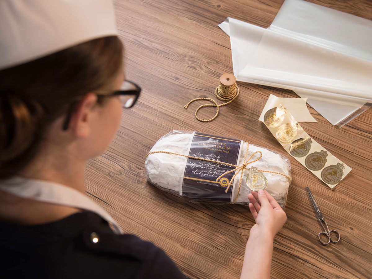 Dass der Dresdner Stollen so besonders schmeckt und weit über die Grenzen der sächsischen Landeshauptstadt hinaus bekannt ist, liegt an der traditionellen Backweise und den strengen Regeln für die Zutaten. Nur, wer die Mindestanforderungen erfüllt und seinen Stollen vom Stollenschutzverband prüfen lässt, erhält das goldene Siegel mit dem geprägten Reiterstandbild Augusts des Starken.